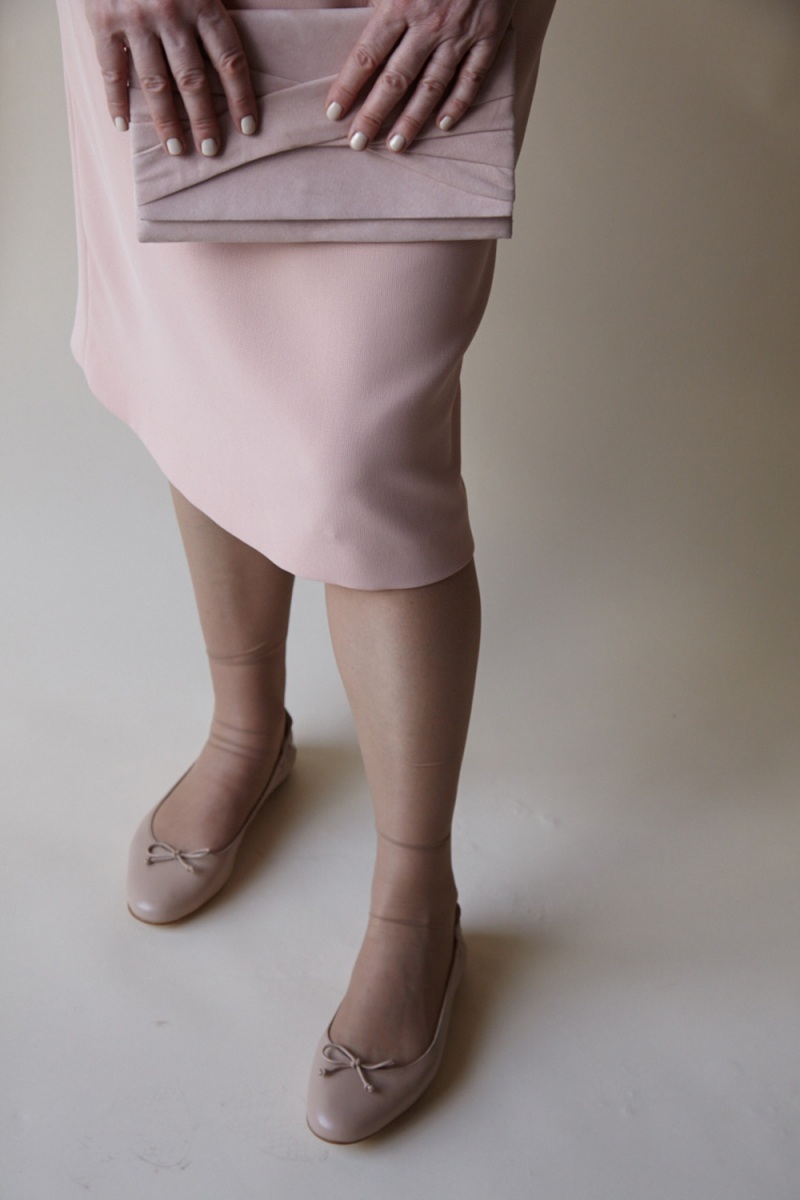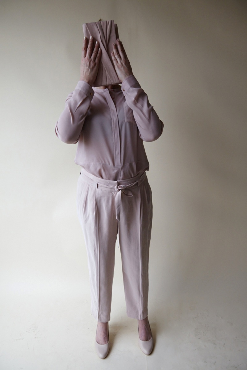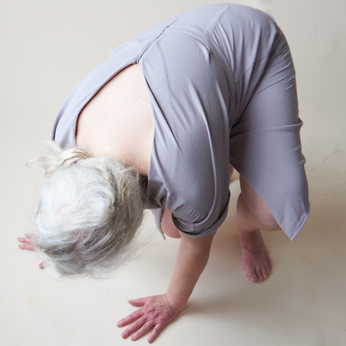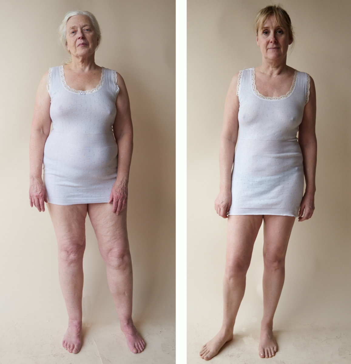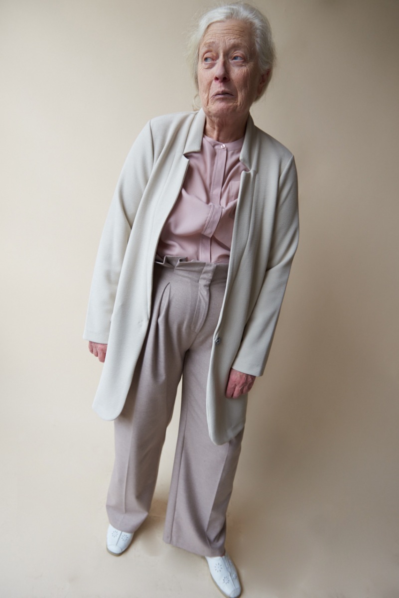 Verity and I decided to search for beige or taupe clothes, that all too ubiquitous supposedly safe older women’s colour choice, ironically cited as ‘this year’s colour’ by the fashion press. I knew full well already that beige drains any colour from my face. I have the fair complexion and freckles that go with having had red hair. If my aim was to look ill or tired, a camel coat always sufficed. Trips to charity shops, hunts through our wardrobes and short-term purchases provided us both with an array of beige clothes. Having admired each other’s finds when we met for our photography session, we also took the time to connect and face our fears about making ourselves intentionally ugly and unappealing, whatever that might mean, and as a means to accept how we are. We took it in turns in front of the camera and bounced ideas from one another. Wrinkled tights, awkward stances, hiding within and behind beige, curling up on the floor and struggling to get up, or even allowing myself to look as if I was out for the day from a care home, we were playing with appearances and allowing ourselves to make the worst of it. My mother’s woollen vest, in soft beige offered us a unifying image pairing, an honesty which we both embraced for Studies in beige.