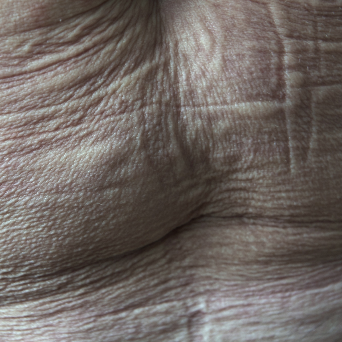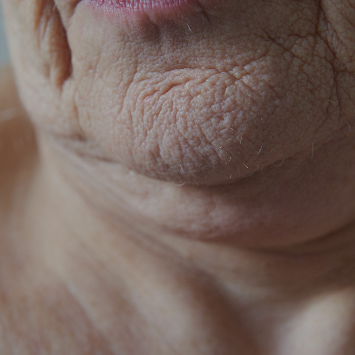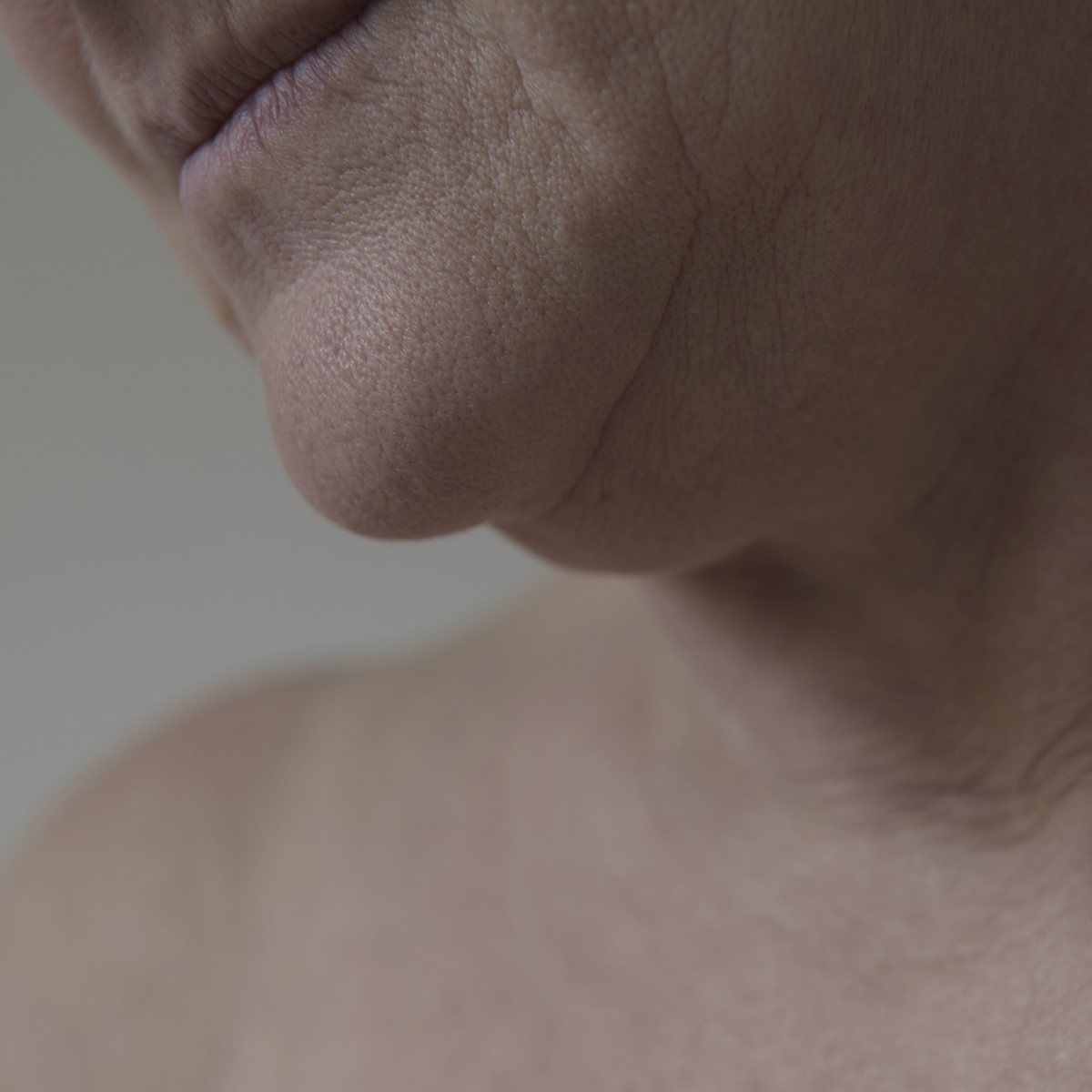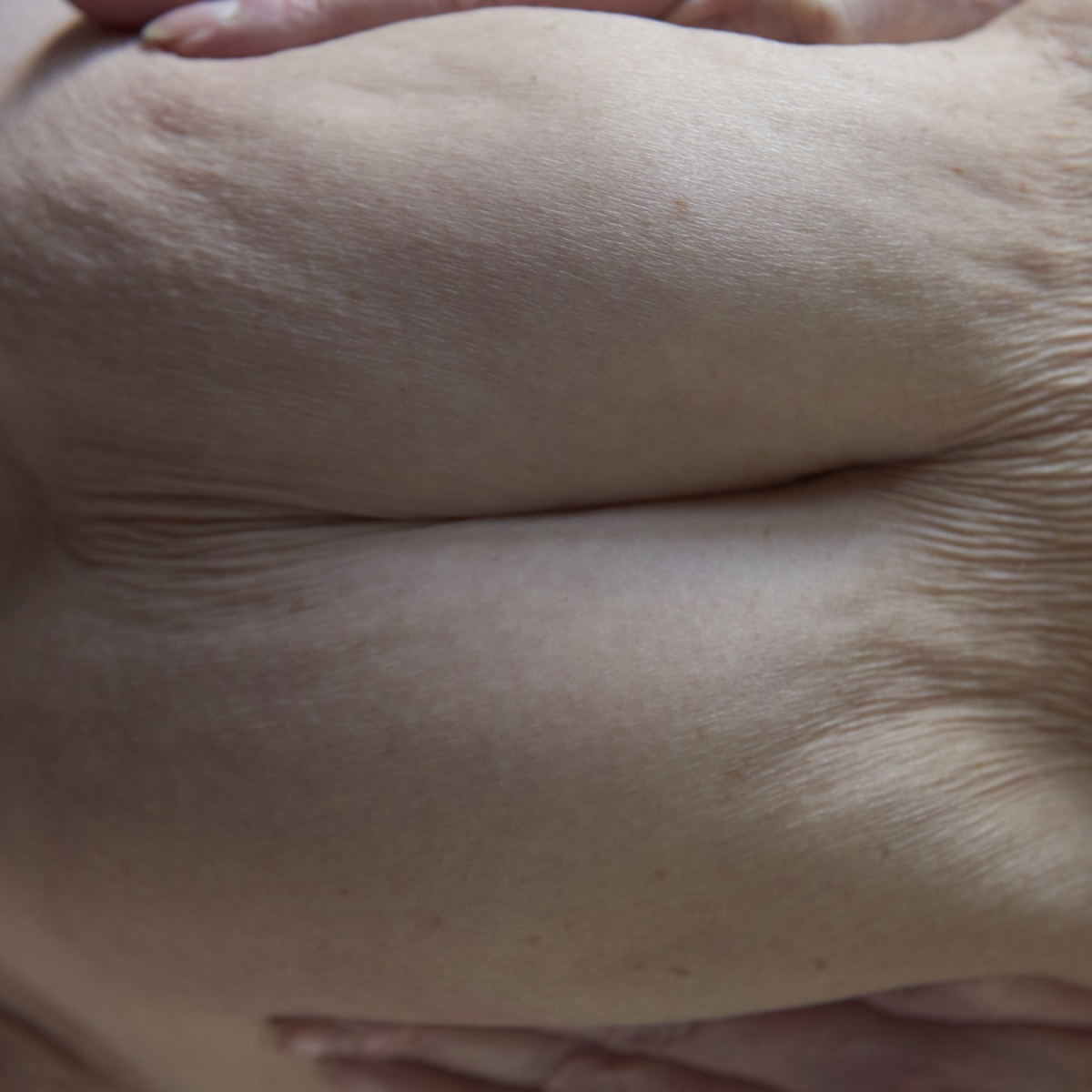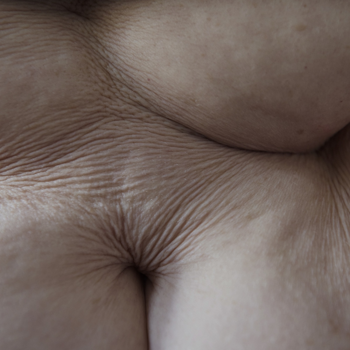 We chose to examine our bodies for those infamous “signs of ageing” that advertisers and the media focus upon: wrinkles on our hands and faces, widening waistlines and sagging bellies. Using a macro lens and video, we made these strange through extreme close-up, cropping, and active performances, for example using our bellies as drums. How mysteriously could we show our bodies so that the viewer would be uncertain as to what they were looking at? Whilst initially we did want these images to be strange, even repellent and shocking, the more important aspect was to show just how ordinary, commonplace and ubiquitous real lived-in flesh is.
